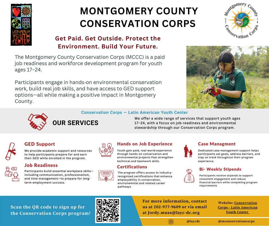 Interested in building your future while protecting the environment? Join LAYC's Montgomery County Conservation Corps (MCCC)—a paid job readiness and workforce development program for youth ages 17–24!